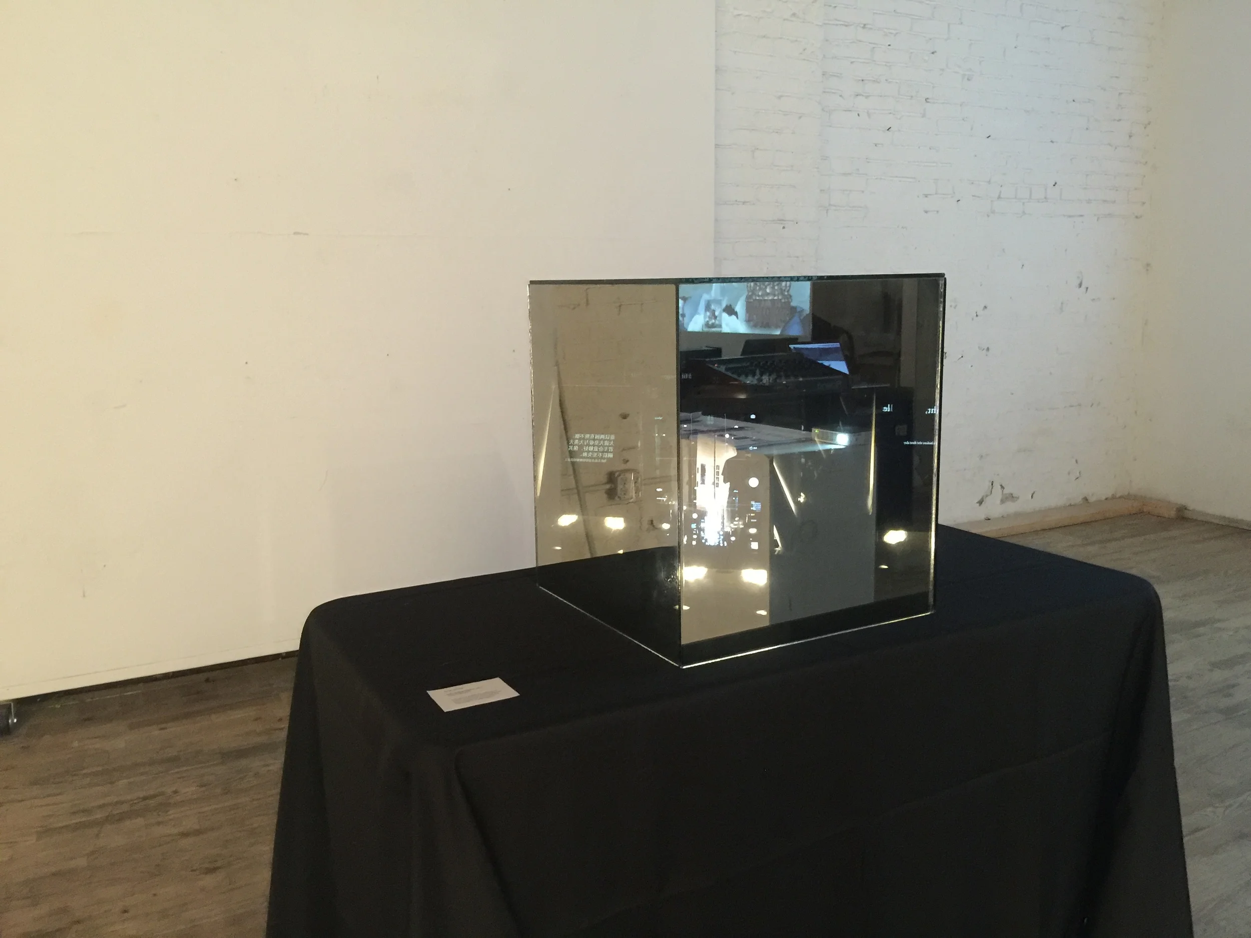 Medium: one way mirrors, iPads (“bullet” curtain, front camera on), aluminium